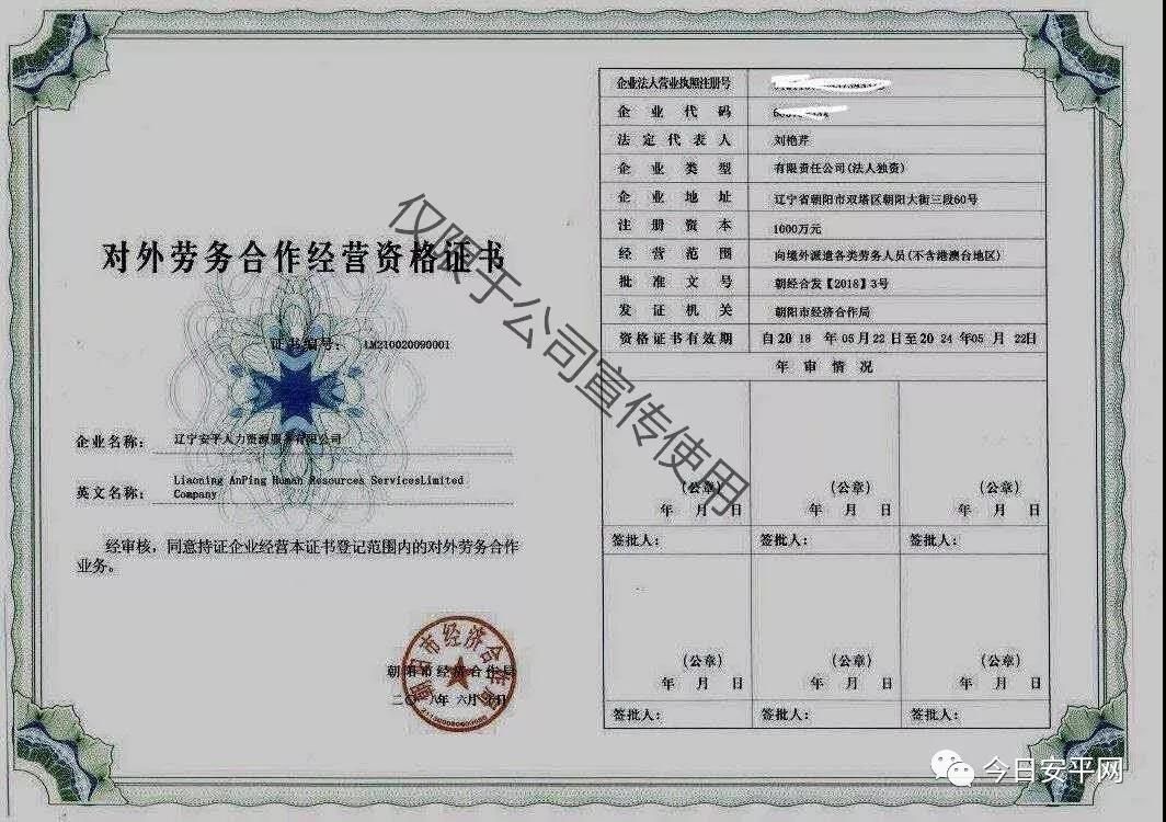 遼寧安平人力資源服務(wù)有限公司成功獲得了商務(wù)部頒發(fā)的對(duì)外勞務(wù)合作經(jīng)營許可證,多年的境內(nèi)勞務(wù)派遣經(jīng)驗(yàn)使我公司掌握著全國24個(gè)省份人力資源信息,通過專業(yè)的服務(wù)于世界20多個(gè)國家開展了勞務(wù)合作,為每一位客戶量身訂做出國就業(yè)方案,圓其出國夢(mèng)想。