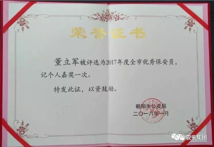 2018年2月9日,榜樣安平人,中心醫(yī)院保安員董立軍,4380次無失誤執(zhí)勤,堅守一個平凡保安員的職業(yè)操守,彰顯平凡崗位的人性光輝,朝陽安平保安服務(wù)公司保安員董立軍被朝陽市公安局授予“全市優(yōu)秀保安員”榮譽(yù)稱號,記個人嘉獎一次。