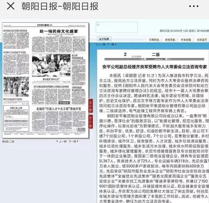 2018年6月12日,安平集團(tuán)副總經(jīng)理被朝陽市人大常委會選中,聘為地方立法咨詢專家,這不僅是對齊總個人工作的一種肯定,更是對安平公司在城鄉(xiāng)建設(shè)與管理方面做出突出貢獻(xiàn),工作模式專業(yè)化的一種認(rèn)可