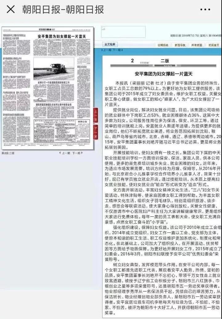 2018年7月8日,安平婦委會工作被認(rèn)可,在安平公司內(nèi)部,每一個女職工都是先進(jìn)職工代表,展現(xiàn)著安平人勤勞、熱情、堅韌的品質(zhì)。安平集團(tuán)董事長劉艷芹不忘初心,帶領(lǐng)千萬女性走上就業(yè)致富道路,被授予遼寧省工會積極分子、朝陽市三八紅旗手、巾幗創(chuàng)業(yè)之星等多項榮譽(yù)稱號,還是朝陽市五一勞動獎?wù)芦@得者。物業(yè)部經(jīng)理李秀萍從一名保潔員干起,憑借自己的艱苦努力,從保潔班長、物業(yè)經(jīng)理到物業(yè)部負(fù)責(zé)人,是朝陽市五一勞動獎?wù)芦@得者。安平宜居垃圾車司機(jī)李艷每天與垃圾為伍,不怕臟、不怕累、不怕苦,被評為朝陽市十大好工人,并獲得朝陽市五一勞動獎?wù)隆?br />