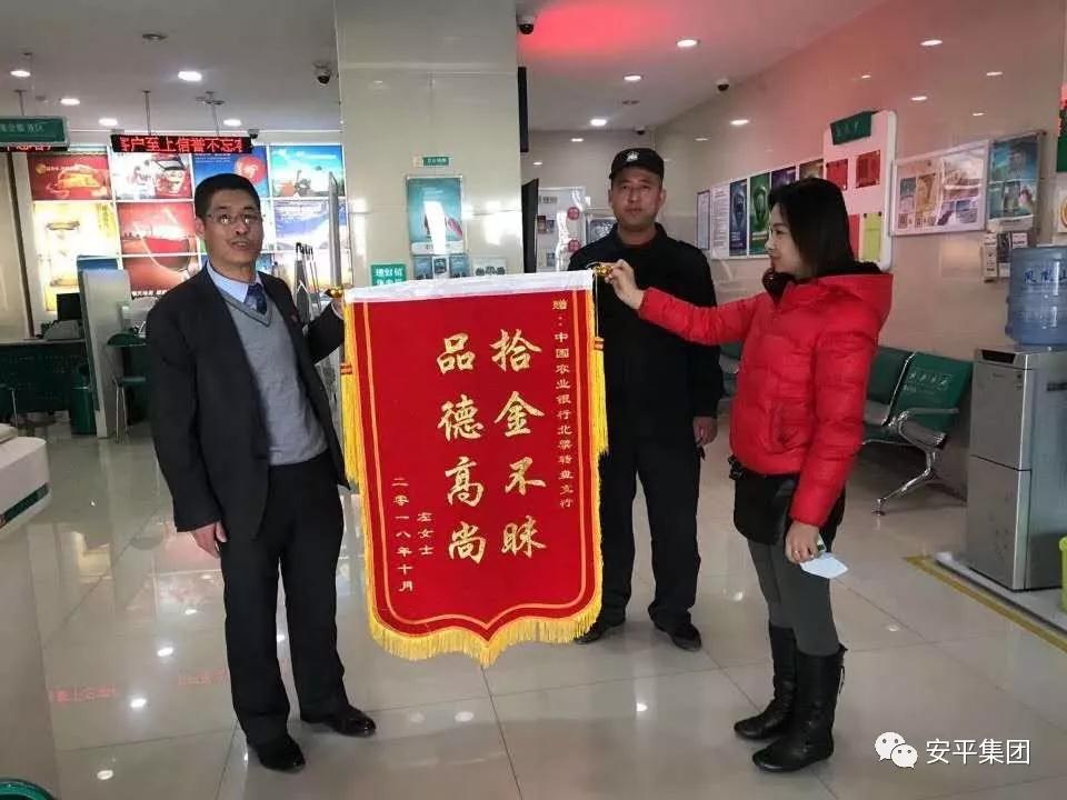 2018年11月28日,感人的事跡接連不斷,安平保安拾金不昧,十萬現(xiàn)金歸還失主,安平駐北票農(nóng)行保安員譚敬海在2018年10月在柜臺邊上發(fā)現(xiàn)一布袋超出半小時無人領(lǐng)取,告知行里領(lǐng)導(dǎo)檢查為10萬元人民幣,經(jīng)過農(nóng)行監(jiān)控錄像確定后,聯(lián)系左女士,了解情況為左女士取款10萬元后忘記帶走落在柜臺邊上,將錢交給失主后非常感激,為表對北票農(nóng)行轉(zhuǎn)盤街支行以及保安員高尚品德拾金不昧的精神特送錦旗一面。